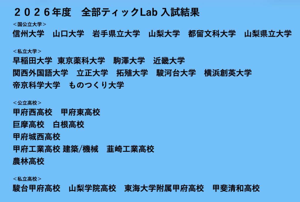 全部ティックLabは小学1年生から高校3年生・高卒生までを対象とした南アルプス市・韮崎市の個別指導専門の学習塾です
